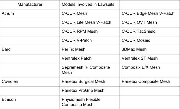 HERNIA MESH MAKERS AND PRODUCTS IN CURRENT LAWSUITS